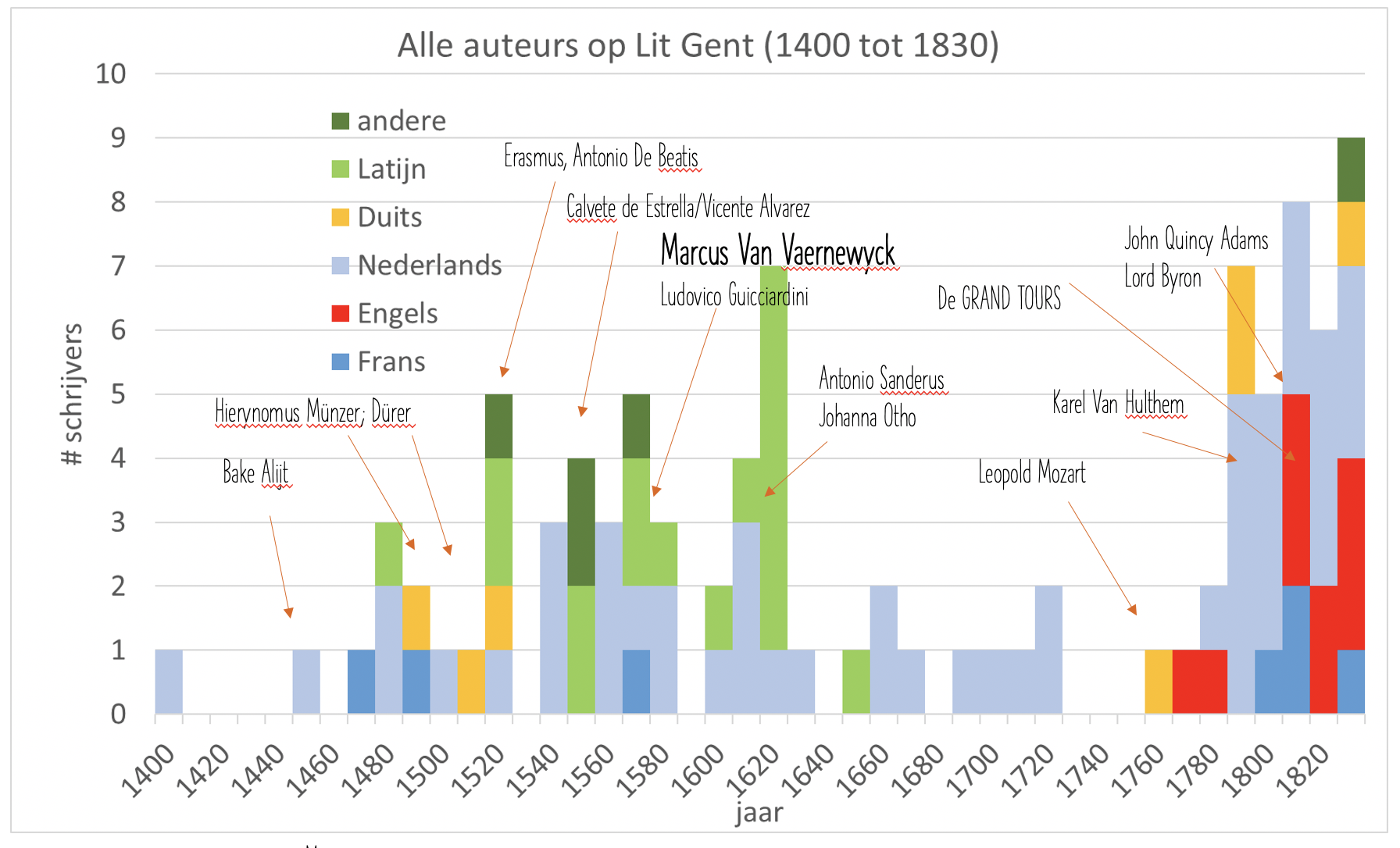 NieuwsLiterair Gent ging in het afgelopen jaar op verkenning in het leven van godsgeleerden en diplomaten, bij monumentenzorg en een Gents lid van de Waffen-SS, selecteerde Gentse tekstfragmenten over onder meer de crypte van de Sint-Baafskathedraal, het Museum voor Schone Kunsten en het STAM, dook onder in de Tachtigjarige Oorlog en de 'Honderd Dagen', keek mee in het Gentse begijnenleven, stond aan de zijlijn van de wielerklassieker Gent-Wevelgem en zag de Schilderstraat, station Gent-Dampoort, de Watersportbaan en de Leie opduiken in Gentse gedichten. Alles speelde zich af tussen 1565 en 2024.